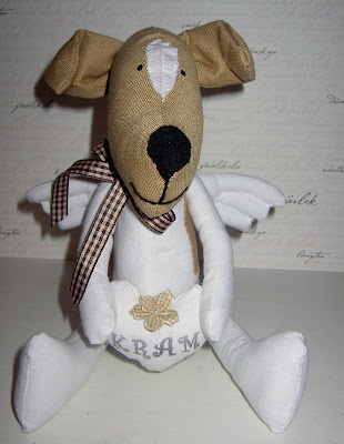 Jag har gått och funderat på att göra en liten hund som påminner oss om henne. I dag blev hon klar, med sina bruna fläckar occh allt!